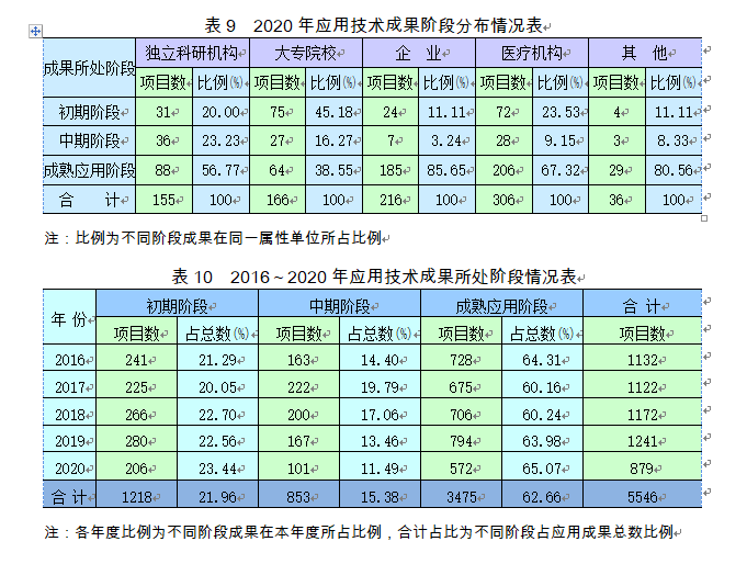本年度登記的879項(xiàng)應(yīng)用技術(shù)成果處于初級(jí)階段的為206項(xiàng),處于中期階段的為101項(xiàng),處于成熟應(yīng)用階段的為572項(xiàng),分別占登記應(yīng)用成果的23.44%、11.49%、65.07%,各階段成果在不同屬性單位的分布件表11。從表9中可以看出,企業(yè)和醫(yī)療機(jī)構(gòu)完成的應(yīng)用成果中,成熟應(yīng)用階段的成果占本屬性單位成果總數(shù)的比例非常高,分別達(dá)到了82.396%和66.27%,說(shuō)明企業(yè)和醫(yī)療機(jī)構(gòu)的研究更注重實(shí)際應(yīng)用。表10列出的是2016~2020年應(yīng)用技術(shù)成果所處階段情況。