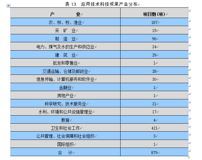 按應(yīng)用行業(yè)對(duì)879項(xiàng)應(yīng)用技術(shù)成果分類(lèi)統(tǒng)計(jì),可應(yīng)用于第一產(chǎn)業(yè)(農(nóng)、林、牧、漁業(yè))的項(xiàng)目為187項(xiàng),占應(yīng)用成果總數(shù)的21.27%;可應(yīng)用于第二產(chǎn)業(yè)(包括采礦業(yè)、制造業(yè)、電力、煤氣及水的生產(chǎn)和供應(yīng)業(yè)、建筑業(yè))的項(xiàng)目為164項(xiàng),占應(yīng)用成果總數(shù)的18.66%;應(yīng)用于第三產(chǎn)業(yè)(批發(fā)和零售業(yè)、交通運(yùn)輸、倉(cāng)儲(chǔ)和郵政業(yè)、信息傳輸計(jì)算機(jī)服務(wù)和軟件業(yè)、金融業(yè)、科學(xué)研究和技術(shù)服務(wù)業(yè)、水利和環(huán)境公共設(shè)施管理業(yè))的項(xiàng)目為99項(xiàng),占應(yīng)用成果總數(shù)的11.26%;公共服務(wù)業(yè)(包括教育、衛(wèi)生和社會(huì)保障業(yè)、社會(huì)福利業(yè)、文化和體育業(yè)、娛樂(lè)業(yè)、公共管理和社會(huì)組織、國(guó)際組織)的項(xiàng)目為429項(xiàng),占應(yīng)用項(xiàng)目總數(shù)的48.81%(見(jiàn)表13)。