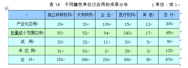 本年度登記的879項(xiàng)應(yīng)用技術(shù)成果,產(chǎn)業(yè)化應(yīng)用項(xiàng)目205項(xiàng),占應(yīng)用項(xiàng)目的23.32%;小批量或小范圍應(yīng)用項(xiàng)目459項(xiàng),占應(yīng)用項(xiàng)目的52.22%;試用項(xiàng)目90項(xiàng),占應(yīng)用項(xiàng)目的10.24%;未應(yīng)用項(xiàng)目125項(xiàng),占應(yīng)用項(xiàng)目的14.22%。成果應(yīng)用率為85.78%。項(xiàng)目應(yīng)用情況在各屬性單位的分布見(jiàn)表14。