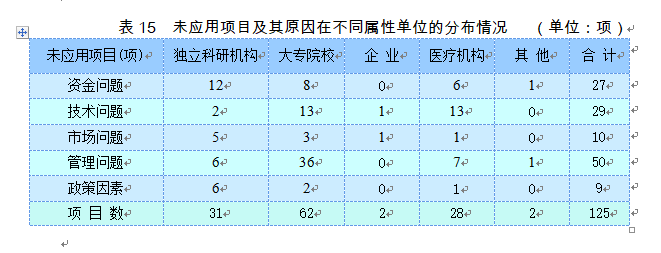 未應(yīng)用成果項(xiàng)目125項(xiàng)。成果未應(yīng)用的原因主要包括:資金問(wèn)題、技術(shù)問(wèn)題、市場(chǎng)問(wèn)題、管理問(wèn)題和政策因素,具體分布情況見(jiàn)表15。