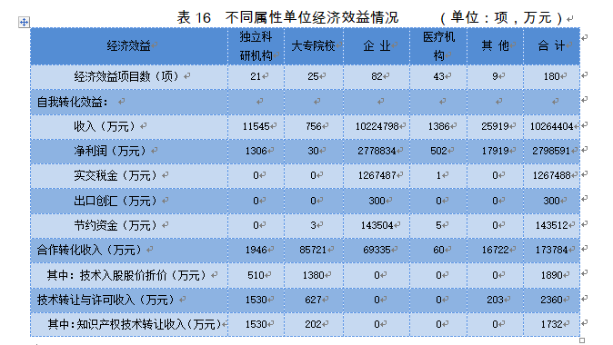 879項(xiàng)應(yīng)用成果中,產(chǎn)生經(jīng)濟(jì)效益項(xiàng)目數(shù)180項(xiàng),占應(yīng)用技術(shù)成果的20.48%。產(chǎn)生的經(jīng)濟(jì)效益情況如表16所示。