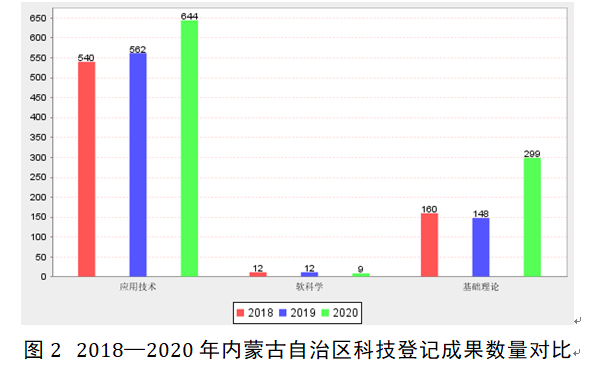 2020年度,內(nèi)蒙古自治區(qū)登記成果952項(xiàng),成果總量仍以應(yīng)用技術(shù)類成果為主,達(dá)644項(xiàng),基礎(chǔ)理論類成果為299項(xiàng),軟科學(xué)類成果9項(xiàng)(見圖1)。