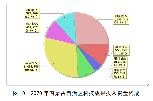 2020年度內(nèi)蒙古自治區(qū)登記的成果,經(jīng)費(fèi)累計(jì)投入4983969萬(wàn)元,其中,國(guó)家投入1286346萬(wàn)元,占投入總額的25.8%;部門投入517968萬(wàn)元,占投入總額10.4%;地方投入分別為478127萬(wàn)元,占投入總額的9.6%;基金投入1474798萬(wàn)元,占投入總額的29.6%;自有資金投入453243萬(wàn)元,占投入總額的9.1%;銀行貸款217216萬(wàn)元,占投入總額的4.4%;其他資金投入556271萬(wàn)元,占投入總額的11.2%。數(shù)據(jù)表明,國(guó)家投入和基金投入是研究開發(fā)經(jīng)費(fèi)的主要來(lái)源(見圖10)。