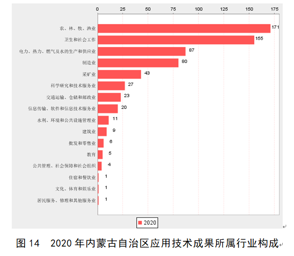 2020年全區(qū)登記應(yīng)用技術(shù)類成果從行業(yè)來(lái)看,農(nóng)、林、牧、漁業(yè)171項(xiàng),占應(yīng)用技術(shù)成果總數(shù)的26.6%,占比最高;其次衛(wèi)生和社會(huì)工作155項(xiàng),占比24.1%;第三是電力、熱力、燃?xì)饧八纳a(chǎn)和供應(yīng)業(yè)87項(xiàng),占應(yīng)用技術(shù)成果總數(shù)的13.5%;其他依次為制造業(yè)80項(xiàng),占比12.4%;采礦業(yè)43項(xiàng),占比6.7%;科學(xué)研究和技術(shù)服務(wù)業(yè)27項(xiàng),占比4.2%;交通運(yùn)輸、倉(cāng)儲(chǔ)和郵政業(yè)23項(xiàng),占比3.6%;信息傳輸、軟件和信息技術(shù)服務(wù)業(yè)20項(xiàng),占比3.1%;水利環(huán)境和公共設(shè)施管理業(yè)11項(xiàng)。占比1.7%;建筑業(yè)9項(xiàng),占比1.4%;批發(fā)和零售業(yè)6項(xiàng),占比0.9%;教育5項(xiàng),占比0.8%。公共管理、社會(huì)保障和社會(huì)組織4項(xiàng),占比0.6%;住宿和餐飲業(yè),文化、體育和娛樂(lè)業(yè),居民服務(wù)、修理和其他服務(wù)業(yè)各1項(xiàng),各占比0.2%。數(shù)據(jù)表明我區(qū)農(nóng)、林、牧、漁業(yè)與衛(wèi)生和社會(huì)工作項(xiàng)目及電力、熱力、燃?xì)饧八纳a(chǎn)和供應(yīng)業(yè)的科技創(chuàng)新能力較強(qiáng),取得的成果較多。(見圖14)