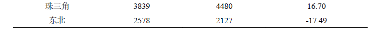 按經(jīng)濟區(qū)域劃分,珠三角、京津冀地區(qū)實現(xiàn)成果登記數(shù)量的增長。珠三角地區(qū)登記科技成果4480項,同比增長16.70%;京津冀地區(qū)登記科技成果6145項,同比增長2.76%;長三角地區(qū)和東北地區(qū)出現(xiàn)下降(見表3-2)。