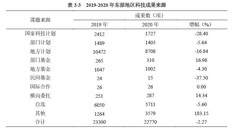 東部地區(qū)登記的科技成果中,仍以各級財政支持的各類計劃(包括國家科技計劃、部門計劃和地方計劃)為主,占比為52.00%。其中,由地方計劃資助的科技成果數(shù)量占東部地區(qū)科技成果登記總量的38.24%,遠高于國家科技計劃和部門計劃資助的科技成果。部門基金和橫向委托資助的科技成果登記數(shù)量增長明顯,增幅分別為16.98%和14.34%(見表3-3、圖3-2)