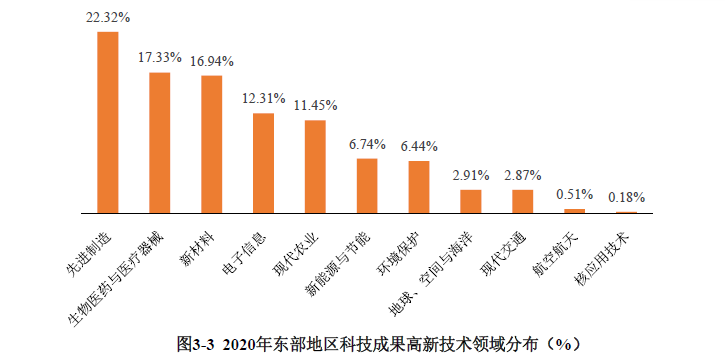 從技術(shù)領(lǐng)域分布上看,東部地區(qū)以先進制造領(lǐng)域科技成果最多,占比22.32%;其次是生物醫(yī)藥與醫(yī)療器械領(lǐng)域和新材料領(lǐng)域,登記成果數(shù)量占比分別為17.33%和16.94%(見圖3-3)。