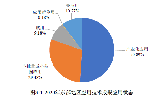 東部地區(qū)登記的科技成果中,產(chǎn)業(yè)化應(yīng)用的比例最高,為50.89%;小批量或小范圍應(yīng)用的占比為29.48%,未應(yīng)用的成果占比為10.27%,試用的成果占比為9.18%(見圖3-4)。