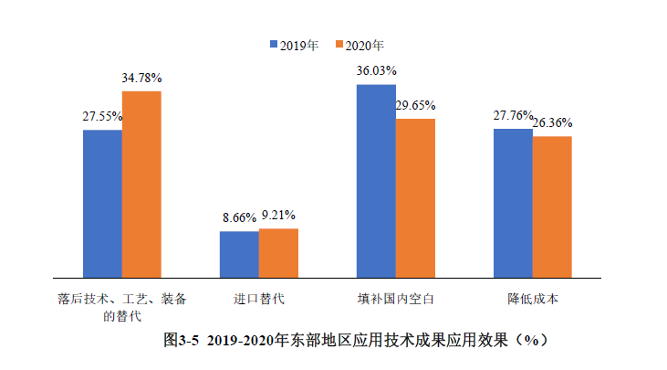 通過對東部地區(qū)登記的應(yīng)用技術(shù)成果的應(yīng)用效果抽樣分析,14594項科技成果中,替代落后技術(shù)、工藝、裝備的占比為34.78%,較上年增加7.23個百分點;填補國內(nèi)空白的占比為29.65%;替代進口的科技成果占比僅為9.21%(見圖3-5)。
