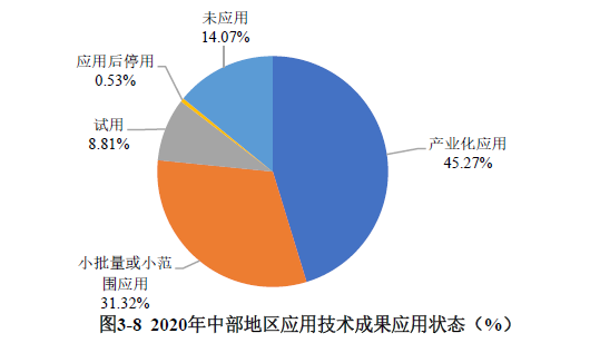 中部地區(qū)登記的應(yīng)用技術(shù)成果中,產(chǎn)業(yè)化應(yīng)用的比例為45.27%;小批量或小范圍應(yīng)用的占31.32%;未應(yīng)用的科技成果占14.07%,試用的科技成果占8.81%(見圖3-8)。