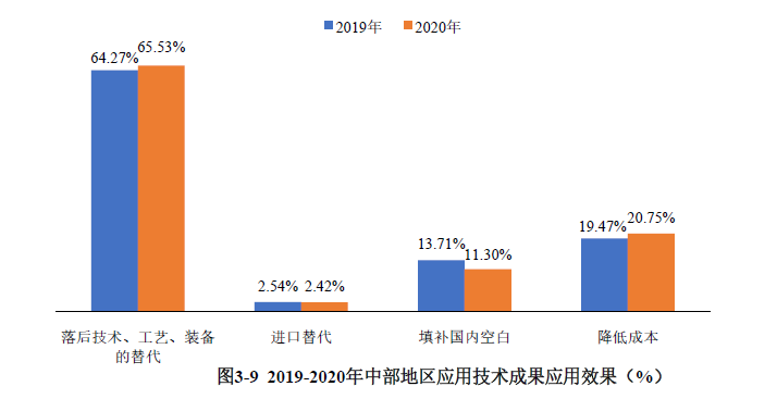通過對中部地區(qū)登記的應(yīng)用技術(shù)成果的應(yīng)用效果抽樣分析,21020項科技成果中,替代落后技術(shù)、工藝、裝備的科技成果占比為65.53%,較上年增加1.26個百分點(見圖3-9)。