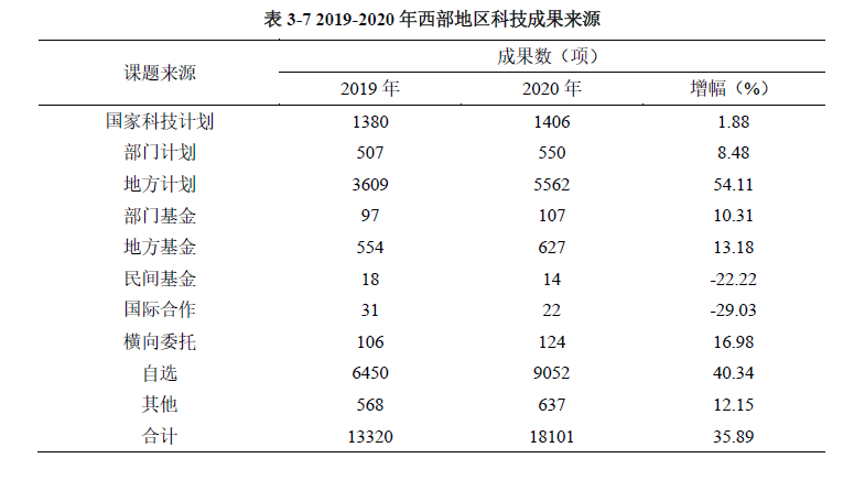 西部地區(qū)登記的科技成果中自選項目居首位,登記成果9052項,占比為50.01%,同比增長40.34%。財政支持的各類計劃項目科技成果占四成,其中,來自地方計劃的科技成果5562項,占比為30.73%,同比增長54.11%(見表3-7、圖3-10)。