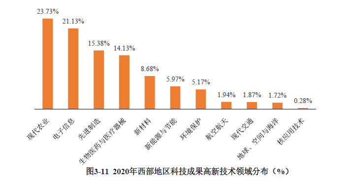 西部地區(qū)共登記高新技術(shù)領(lǐng)域科技成果9936項,同比增長53.00%。各類高新技術(shù)領(lǐng)域登記的科技成果數(shù)量較上一年均有顯著上升。其中,航空航天領(lǐng)域應(yīng)用技術(shù)成果增幅居首位,同比增長171.83%。從技術(shù)領(lǐng)域分布上看,現(xiàn)代農(nóng)業(yè)領(lǐng)域的應(yīng)用技術(shù)成果數(shù)量最多,為2358項,占比為23.73%;電子信息和先進制造領(lǐng)域的應(yīng)用技術(shù)成果居第二位和第三位,占比分別為21.13%和15.38%(見表3-8、圖3-11)。