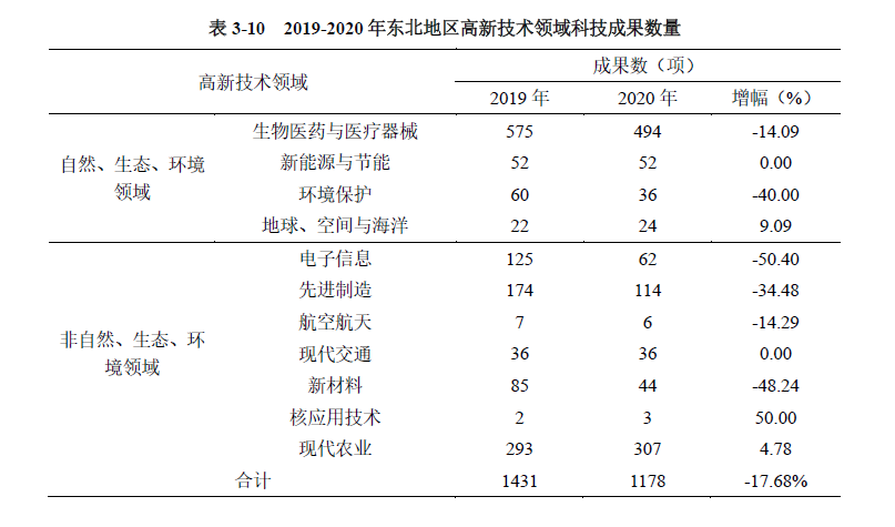 東北地區(qū)登記的高新技術(shù)成果中,非自然、生態(tài)、環(huán)境領(lǐng)域科技成果占比為48.56%,比上年下降了1.90個百分點(詳見附表9)。