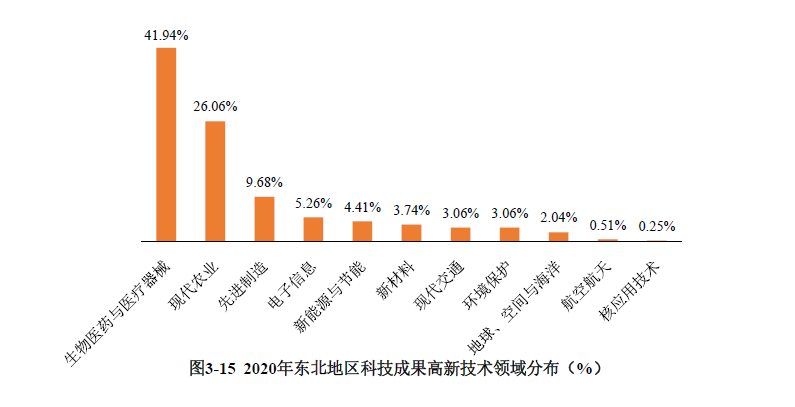 東北地區(qū)共登記高新技術(shù)領(lǐng)域成果1178項。從技術(shù)領(lǐng)域分布看,東北地區(qū)的高新技術(shù)成果主要集中在生物醫(yī)藥與醫(yī)療器械和現(xiàn)代農(nóng)業(yè)領(lǐng)域,分別占東北地區(qū)高新技術(shù)成果總量的41.94%和26.06%;其他領(lǐng)域的應(yīng)用技術(shù)成果數(shù)量及占比相對較低(見表3-10、圖3-15)。