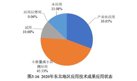 東北地區(qū)登記的科技成果中,小批量或小范圍應(yīng)用的科技成果比例最高,占比為45.53%;產(chǎn)業(yè)化應(yīng)用的科技成果占比為30.65%;未應(yīng)用的科技成果占比為13.08%,試用的科技成果占比為10.68%(見圖3-16)。