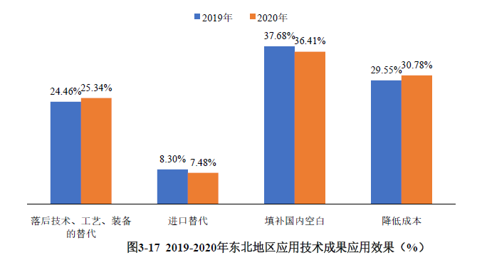 通過對東北地區(qū)登記的應(yīng)用技術(shù)成果的應(yīng)用效果抽樣分析,7240項科技成果中,填補國內(nèi)空白的科技成果占比為36.41%;降低成本的科技成果占比為30.78%,較上年增加1.23百分點(見圖3-17)。