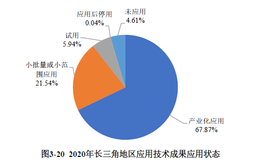 長三角地區(qū)登記的應(yīng)用技術(shù)成果中,產(chǎn)業(yè)化應(yīng)用的科技成果比例最高,為67.87%;小批量或小范圍應(yīng)用的科技成果占比為21.54%;試用的科技成果占比為5.94%;未應(yīng)用的科技成果占比較低,僅為4.61%(見圖3-20)。