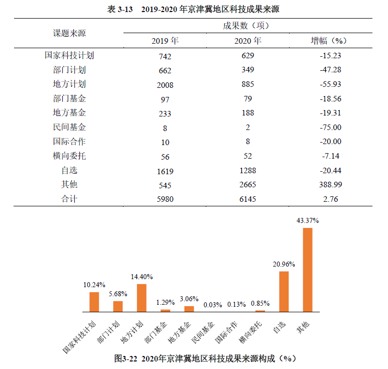 京津冀地區(qū)登記的科技成果中,來自自選課題的科技成果1288項,占比20.96%。財政支持的各類科技計劃(包括國家科技計劃、部門計劃和地方計劃)科技成果數(shù)量較上年均有所下降,占比合計為30.32%(見表3-13、圖3-22)。