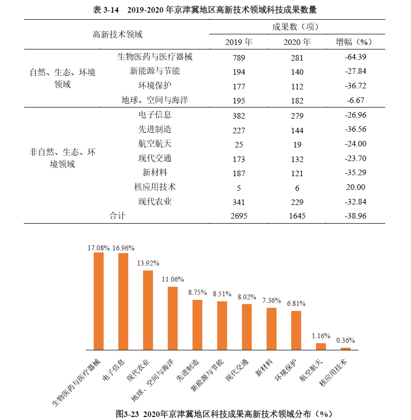 京津冀地區(qū)登記的高新技術(shù)成果中,非自然、生態(tài)、環(huán)境領(lǐng)域科技成果占比為56.95%,較上年增長了7.23個百分點(詳見附表9)。