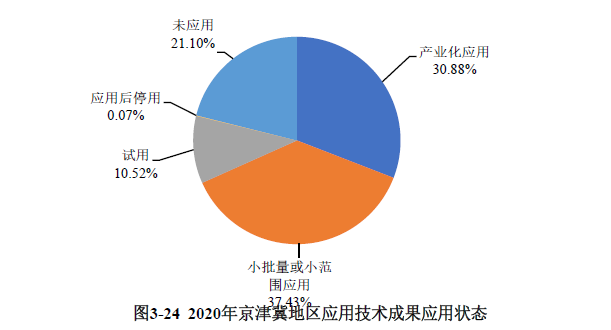 京津冀地區(qū)登記的應(yīng)用技術(shù)成果中,產(chǎn)業(yè)化應(yīng)用的科技成果數(shù)量占比為30.88%;小批量或小范圍應(yīng)用的科技成果占比為37.43%;未應(yīng)用的科技成果占比為21.10%;試用的科技成果占比為10.52%(見圖3-24)。