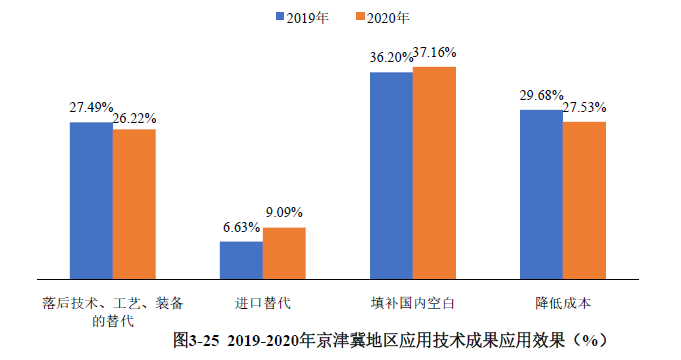 通過對京津冀地區(qū)登記的應(yīng)用技術(shù)成果的應(yīng)用效果抽樣分析,1827項登記的科技成果中,填補國內(nèi)空白的科技成果占比較高,為37.16%(見圖3-25)。