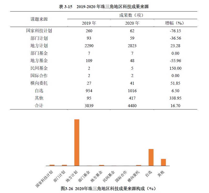 珠三角地區(qū)登記的科技成果來源以地方計劃為主,占比63.01%。國家科技計劃項目科技成果僅占珠三角地區(qū)登記成果總量的1.38%,較上年下降明顯(見表3-15、圖3-26)。