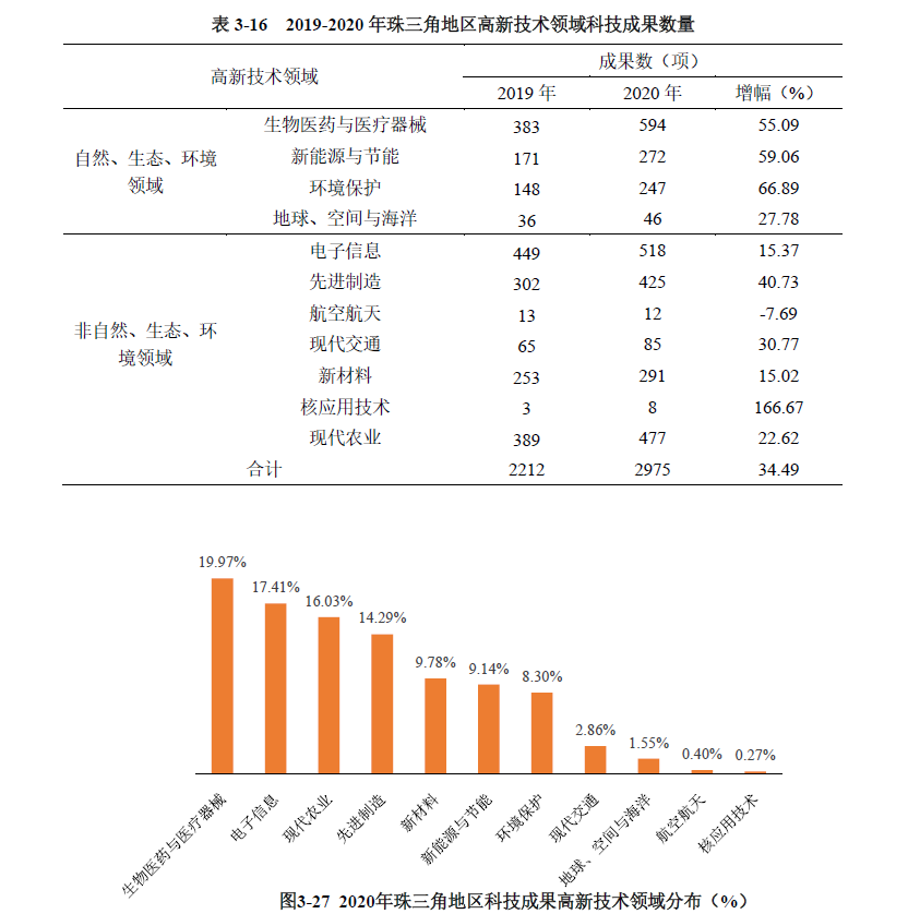 珠三角地區(qū)登記的高新技術(shù)成果中,非自然、生態(tài)、環(huán)境領(lǐng)域科技成果占比為61.04%,比上年下降了5.60個百分點(詳見附表9)。