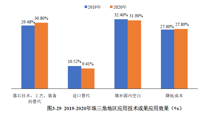 通過對珠三角地區(qū)登記的應(yīng)用技術(shù)成果的應(yīng)用效果抽樣分析,2815項登記的科技成果中,替代落后技術(shù)、工藝裝備和降低成本的科技成果占比分別為30.80%和27.89%,較上年均有小幅增長。進口替代和填補國內(nèi)空白的科技成果數(shù)量占比略有下降(見圖3-29)。