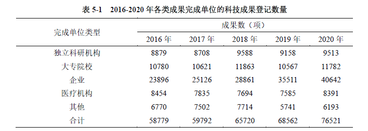 2016-2020年,企業(yè)完成的科技成果登記數(shù)量從23896項增加到40642項,增長了70.08%??萍汲晒耐瓿蓡挝活愋头植记闆r基本穩(wěn)定,大專院校和獨立科研機構(gòu)略有波動,但基本持平(見表5-1)。