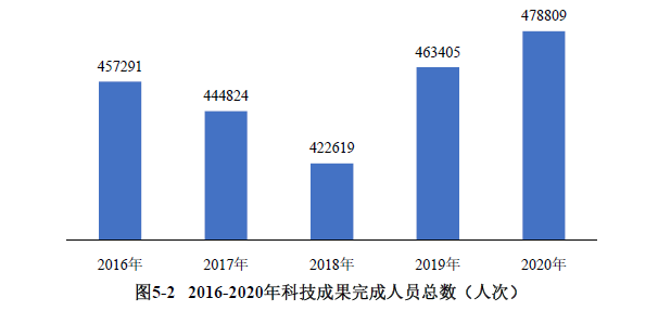 2020年登記的科技成果共涉及完成人478809人次,比上年增長3.32%。2016-2020年,科技成果完成人總?cè)舜纬尸F(xiàn)波動態(tài)勢,2017年和2018年持續(xù)下降,2019年實現(xiàn)較快增長,2020年達(dá)到五年來最高水平(見圖5-2)。