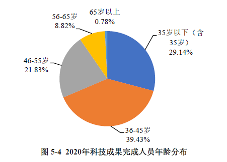 科技成果完成人中,55歲及以下的人員共計432832人次,占登記成果完成總?cè)舜蔚?0.40%。其中,36-45歲研究人員是科技成果研發(fā)的主力軍(見圖5-4)。