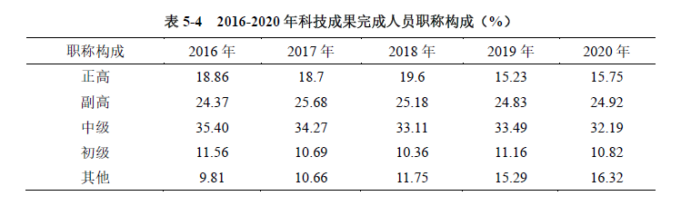 具有正高、副高、中級職稱的研究人員保持較高比例。成果完成人中,具有正高、副高級技術(shù)職稱的完成人共計194737人次(其中院士為1610人次),占總?cè)舜蔚?0.67%;中級技術(shù)職稱的研究人員154137人次,占32.19%。 2016-2020年,科技成果完成人員的職稱構(gòu)成變化不大,具備正高、副高、中級職稱的科技成果完成人員占比略有下降,從2016年的78.63%下降到2020年的72.86%(見表5-4)。