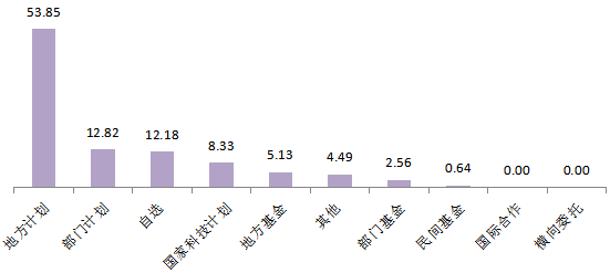 以各級財政支持的計劃項目成果為主。其中,來源于各級科技計劃項目的成果117項,占75.00%;部門基金和地方基金項目成果12項,占7.69%。在各級科技計劃項目中,國家科技計劃項目成果占登記總量的8.33%;部門科技計劃項目成果占12.82%;地方科技計劃項目成果占53.85%。在國家科技計劃項目成果中,國家自然科學(xué)基金和國家重點研發(fā)計劃項目各3項,分別占登記總量的1.92%;國家科技重大專項2項,占登記總量的1.28%;國家科技支撐計劃1項,占登記總量的0.64%;國家其他科技計劃4項,占登記總量的2.56%(見圖2)。