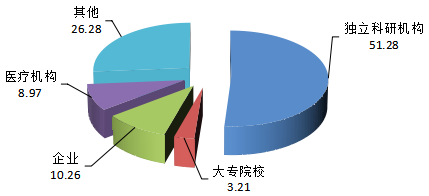 獨立科研院所是項目成果的主要完成單位,按成果數(shù)量排序依次是:獨立科研機構(gòu)80項,占51.28%;其他項目41項,占26.28%;企業(yè)16項,占10.26%;醫(yī)療機構(gòu)14項,占8.97%;大專院校5項,占3.21%(見圖3)。