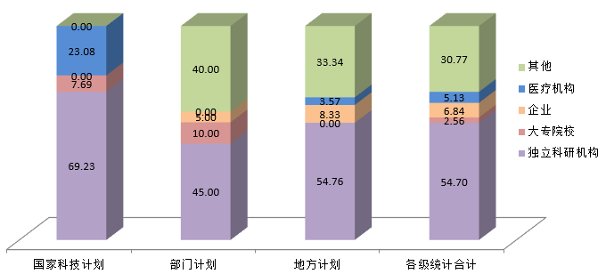 在117項各級科技計劃項目成果中,獨立科研機構(gòu)和其他機構(gòu)是主要完成單位。其中,獨立科研院所所占比例最高,為54.70%;其次是其他機構(gòu)占30.77%(見圖4)。