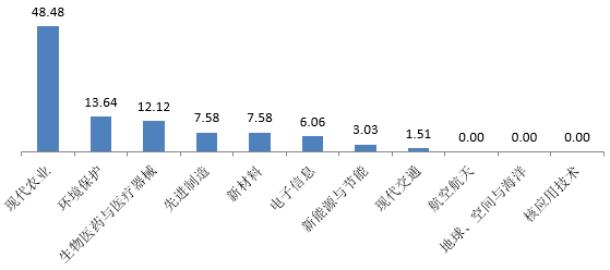 66項應(yīng)用技術(shù)成果屬于高新技術(shù)領(lǐng)域,主要集中在現(xiàn)代農(nóng)業(yè),其次是環(huán)境保護和生物醫(yī)藥與醫(yī)療器械領(lǐng)域,先進制造、新材料和電子信息等領(lǐng)域項目成果也占一定比例(見圖6)。
