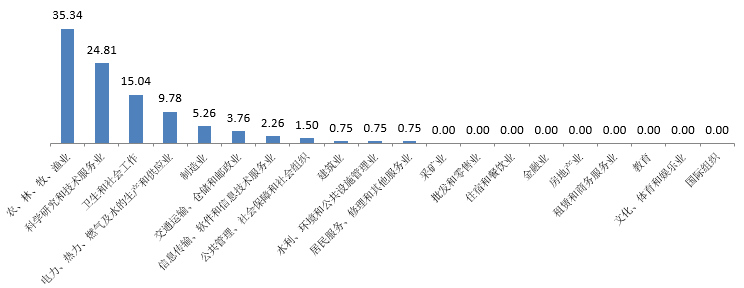 應(yīng)用技術(shù)成果主要應(yīng)用于農(nóng)、林、牧、漁業(yè),占35.34%;科學(xué)研究和技術(shù)服務(wù)業(yè)應(yīng)用成果比例有所提升,占24.81%;衛(wèi)生和社會工作行業(yè)與電力、熱力、燃氣及水的生產(chǎn)和供應(yīng)業(yè)等應(yīng)用成果也占一定比例,分別占15.04%和9.78%(見圖7)。