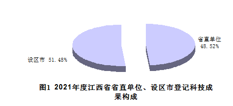 2021年由于加強宣傳,江西省科技成果登記在總量上較去年有所上升,全年共登記1218項,與去年的1070項相比上升了148項,上升13.83%。其中,省直單位的成果登記有591項,占48.52%,比上年度的601項下降了1.66%;設(shè)區(qū)市的成果登記有627項,占成果登記總數(shù)的51.48%,比上年的469項上升了33.69%。全省11個設(shè)區(qū)市成果登記最多的有119項,最少的為21項,全省各設(shè)市區(qū)之間仍有差距。其中宜春市為119項,南昌市為92項,分別占總數(shù)的9.77%和7.55%,占設(shè)區(qū)市總數(shù)的18.98%和14.67%;吉安市為88項,新余市為59項,分別占總數(shù)的7.22%和4.84%,占設(shè)區(qū)市總數(shù)的14.04%和9.41%。(見圖1、表1)。表1中設(shè)區(qū)市的基礎(chǔ)理論成果72項,軟科學成果0項,較去年明顯上升。
