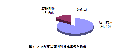 2021年度全省登記的科技成果仍以應用技術(shù)成果為主,為1028項,與上年相比上升了21.95%,占全年登記成果總數(shù)的84.40%;基礎(chǔ)理論成果190項,占成果總數(shù)的15.60%,與上年相比下降了16.30%;軟科學成果0項(見圖3)。
