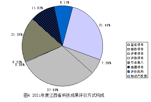 2021年度江西省登記的成果評價方式以驗收為主,機構(gòu)評價、結(jié)題為輔,鑒定及其他評價方式并存。登記成果中驗收項目459項,占登記成果總數(shù)的37.68%,比上年上升6.50個百分點;機構(gòu)評價項目111項,占9.11%,結(jié)題項目144項,占11.82%;知識產(chǎn)權(quán)授權(quán)項目383項,占31.44%;鑒定、評審、評估、行業(yè)準入等其他評價方式項目121項,占9.93%(見圖4)。