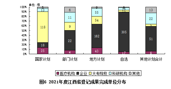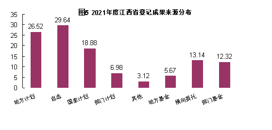 2021年度全省登記的科技成果仍以地方財政支持的各類計劃項目為主,自選和國家科技計劃項目成果占比重也較大(見圖5)。其中,國家科技計劃項目成果230項(科技重大專項3項,自然科學基金146項,高技術(shù)研究發(fā)展計劃18項,國家科技支撐計劃6項,國家重點新產(chǎn)品計劃6項,重點基礎(chǔ)研究發(fā)展計劃2項,,國際科技合作專項1項,國家重點實驗室1項,農(nóng)業(yè)科技成果轉(zhuǎn)化資金1項、其它科技計劃38項),占登記總量的18.88%;部門計劃85項,占6.98%;地方計劃323項,占26.52%;自選361項,占29.64%。地方計劃、自選項目和國家計劃項目是成果的主要來源。