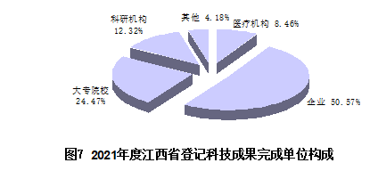2021年度全省登記的科技成果中,按第一完成單位屬性分,企業(yè)登記數(shù)所占比例最大,共616項,占50.57%;其次是大專院校298項,占24.47%,獨立科研機構(gòu)150項,占12.32%,醫(yī)療機構(gòu)103項,占8.46%,其他單位39項,占4.18%。數(shù)據(jù)顯示,2021年我省科技成果主要分布在企業(yè)、大專院校,在成果第一完成單位中所占比例為本年度登記成果完成單位的75.04%,凸顯了企業(yè)與大專院校在我省科技創(chuàng)新中的主體地位(見圖7)。