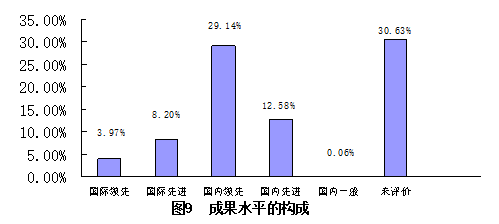 在2021年全省登記的1208項應用技術(shù)成果中,達到國際領(lǐng)先水平項目48項,占應用技術(shù)成果總數(shù)的3.97%;達到國際先進水平的99項,占8.20%;達到國內(nèi)領(lǐng)先和國內(nèi)先進水平的成果共351項,占41.72%;國內(nèi)一般水平的成果7項,占0.06%。未評價成果370項,占30.63%。國內(nèi)先進水平以上的項目占總數(shù)的53.89%以上。(見圖9)。