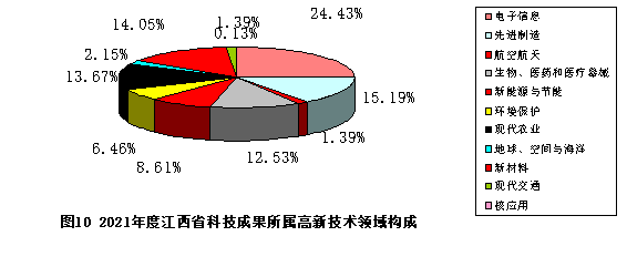 2021年度江西省登記的1208項應用技術(shù)成果中,有790項屬高新技術(shù)領(lǐng)域,占登記的科技成果總數(shù)的64.86%。其中,電子信息193項,占所登記的高新技術(shù)領(lǐng)域成果總量的24.43%;先進制造120項,占15.19%;航空航天11項,占1.39%;現(xiàn)代交通11項,占1.39%;生物醫(yī)藥和醫(yī)療器械99項,占12.53%;新材料111項,占14.05%;新能源與節(jié)能68項,占8.61%;環(huán)境保護51項,占6.46%;地球、空間與海洋17項,占2.15%;核應用技術(shù)1項,占0.13%;現(xiàn)代農(nóng)業(yè)108項,占13.67%。電子信息領(lǐng)域在全省高新技術(shù)領(lǐng)域中所占比例最高,其次先進制造和新材料也都占有較大比例( 見圖10)。