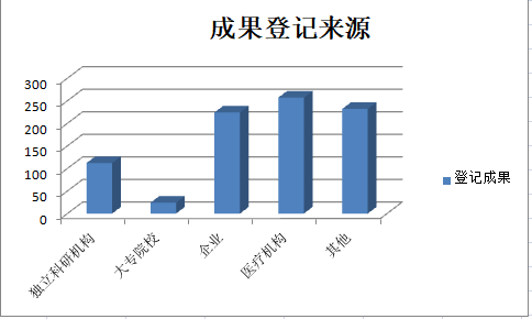 成果登記來源有獨立科研機(jī)構(gòu)、大專院校、企業(yè)、醫(yī)療機(jī)構(gòu)等幾類,其中,獨立科研機(jī)構(gòu)112項,占總量的13.2%;大專院校24項,占總量的2.8%;企業(yè)224項,占總量的26.4%;醫(yī)療機(jī)構(gòu)257項,占總量的30.3%;其他232項,占總量的27.3%。