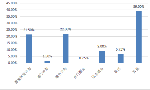 2021年度登記的科技成果仍以各級(jí)財(cái)政支持的各類計(jì)劃項(xiàng)目成果為主,來(lái)源于各級(jí)科技計(jì)劃項(xiàng)目的成果180項(xiàng),占成果登記總數(shù)的45.00%;部門(mén)基金1項(xiàng),占0.25%;地方基金36項(xiàng),占9.00%;自選項(xiàng)目27項(xiàng),占6.75%;其他項(xiàng)目156項(xiàng),占39.00%。各級(jí)計(jì)劃項(xiàng)目中,國(guó)家科技計(jì)劃項(xiàng)目86項(xiàng),占成果登記總數(shù)的21.50%;地方計(jì)劃88項(xiàng),占22.00%;部門(mén)計(jì)劃6項(xiàng),占1.50%。國(guó)家科技計(jì)劃項(xiàng)目成果中,自然科學(xué)基金項(xiàng)目79項(xiàng),占成果登記總數(shù)的19.75%,基地和人才專項(xiàng)2項(xiàng),占0.50%。見(jiàn)圖1:
