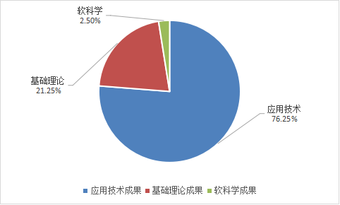在2021年度登記的科技成果中,應(yīng)用技術(shù)成果305項(xiàng),占登記成果總數(shù)的76.25%;基礎(chǔ)理論成果85項(xiàng),占21.25%;軟科學(xué)成果10項(xiàng),占2.50%;應(yīng)用技術(shù)類成果數(shù)量遠(yuǎn)遠(yuǎn)超過(guò)另外兩類成果。見(jiàn)圖6: