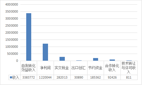(1)2021年登記的科技成果自我轉(zhuǎn)化效益合計(jì)收入338.38億元,其中,凈利潤(rùn)122.00億元,占自我轉(zhuǎn)化總收入的36.06%;實(shí)交稅金28.20億元,占8.33%;出口創(chuàng)匯3.09億元,占0.91%;節(jié)約資金18.54億元,占5.48%。合作轉(zhuǎn)化收入9.24億元,技術(shù)轉(zhuǎn)讓與許可收入收入811.00萬(wàn)元。如圖7: