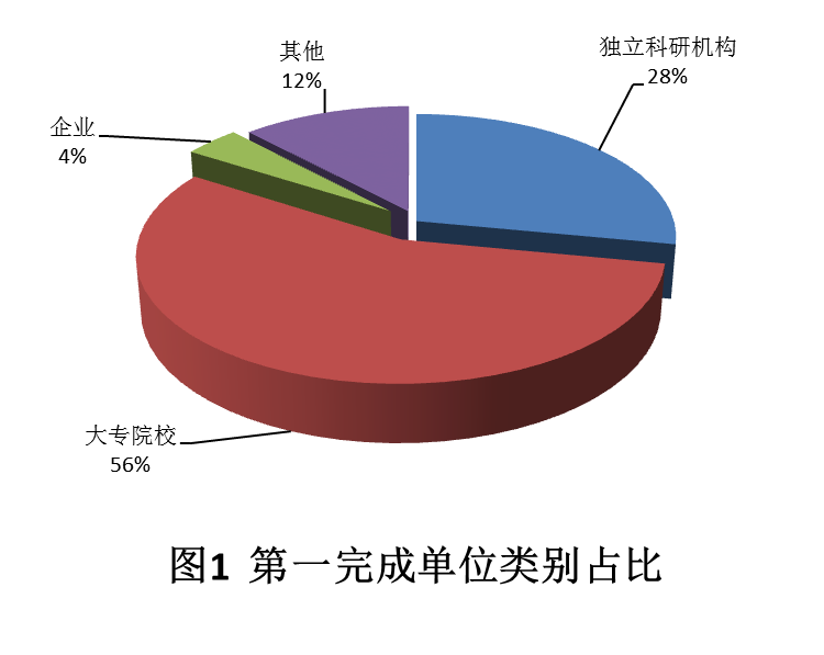 2021年,共登記25項應(yīng)用技術(shù)類科技成果,其中獨立科研機構(gòu)、大專院校、企業(yè)分別登記7項、14項、1項,其他單位登記3項。從第一完成單位類型來看,成果產(chǎn)出以大專院校為主體,占比達56%(圖1),其次是科研機構(gòu),占比為28%,企業(yè)較少,占比僅為4%。